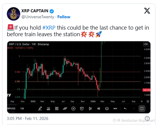 $XRP XRP analyst XRP Captain recently shared a strong message with holders, saying this could be the “last chance to get in before the train leaves the station.” Alongside his statement, he posted a weekly XRP/USD chart from Bitstamp, pointing to what he believes is a major technical shift after a steep decline and sharp rebound.