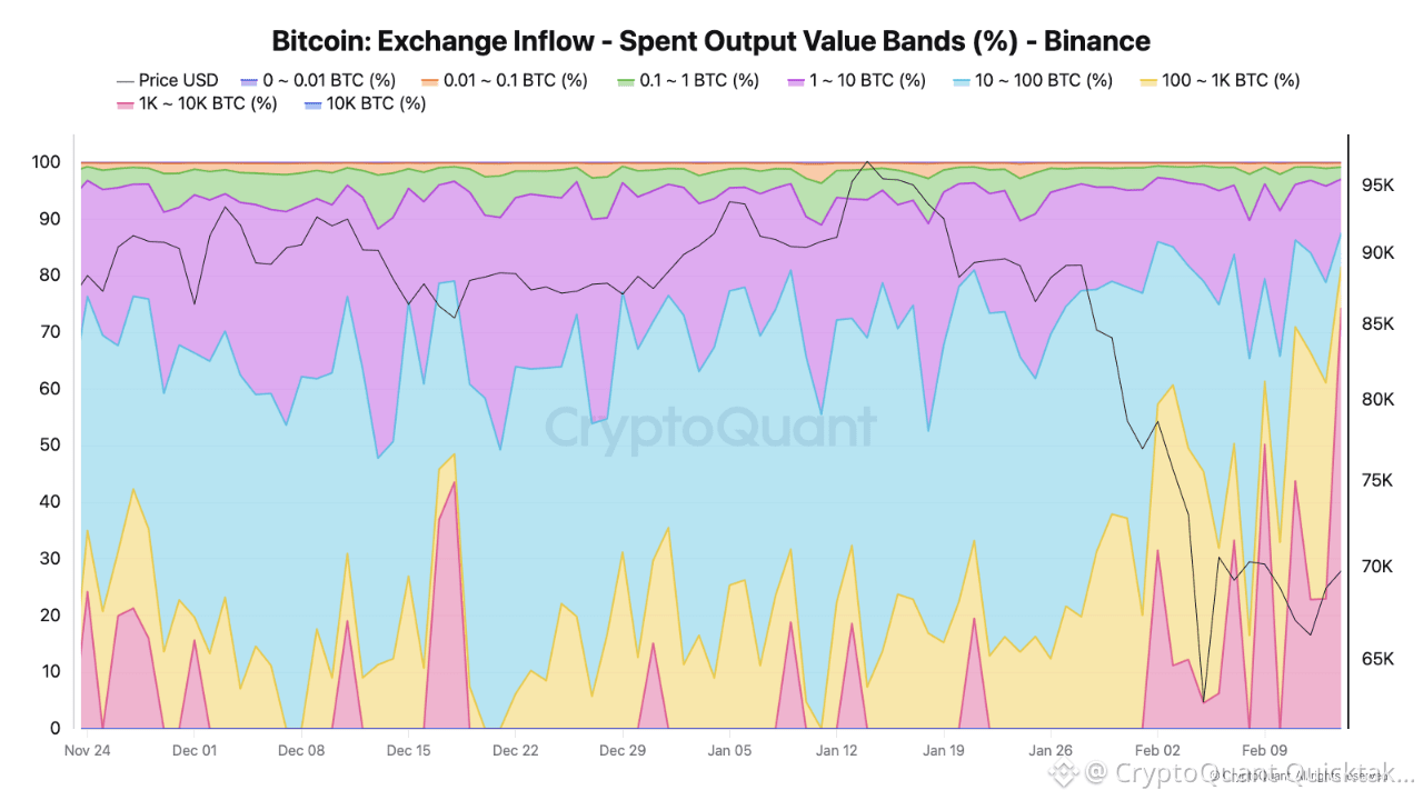 On Binance, we are seeing a rise in inflows coming from the largest transactions. Whether driven by capital rotation, risk management, or strategic repositioning, the share represented by these large flows has increased significantly in recent days. This dynamic suggests that major holders are particularly active during this complex phase of the market.