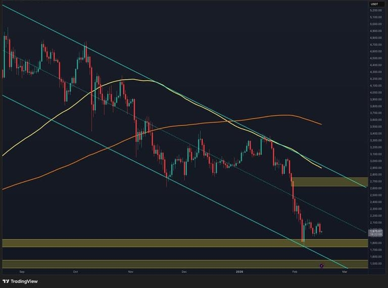 Technicky je aktivum uvězněno mezi statickou podporou $1.8K a střední hranicí klesajícího kanálu, který působí jako dynamická rezistence kolem oblasti $2,500–$2,600. Dokud Ethereum zůstává uvězněno mezi těmito dvěma úrovněmi, tržní struktura odráží stav kolísání spíše než potvrzenou změnu trendu.