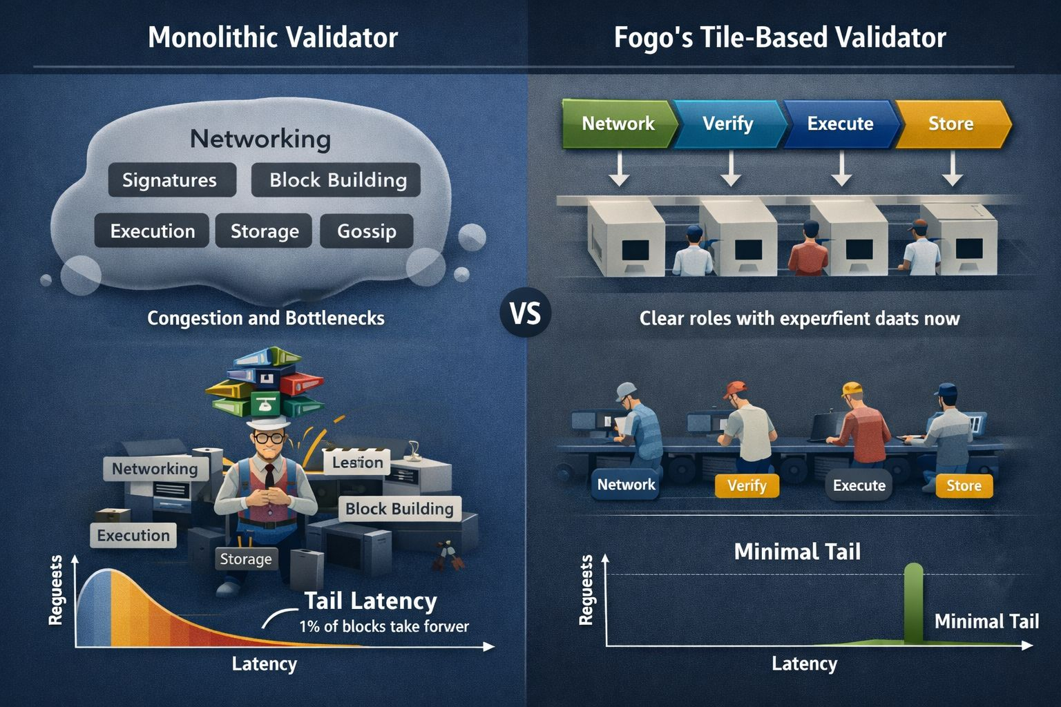 Networking, signature checks, block building, execution, storage, gossip. It’s like hiring one person to be the cashier, cook, cleaner, and security guard. Sure, it works at 2 customers a day.