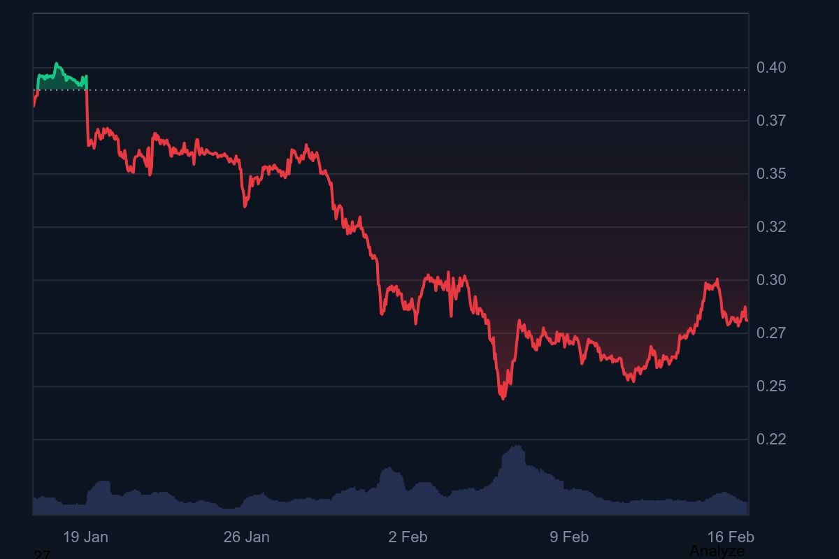From current levels around $0.30, the upper bound implies approximately 8% upside by February 28. However, the projected average of $0.311 signals consolidation rather than breakout momentum. Relative to recent highs near $0.37, ADA remains materially below prior peaks.