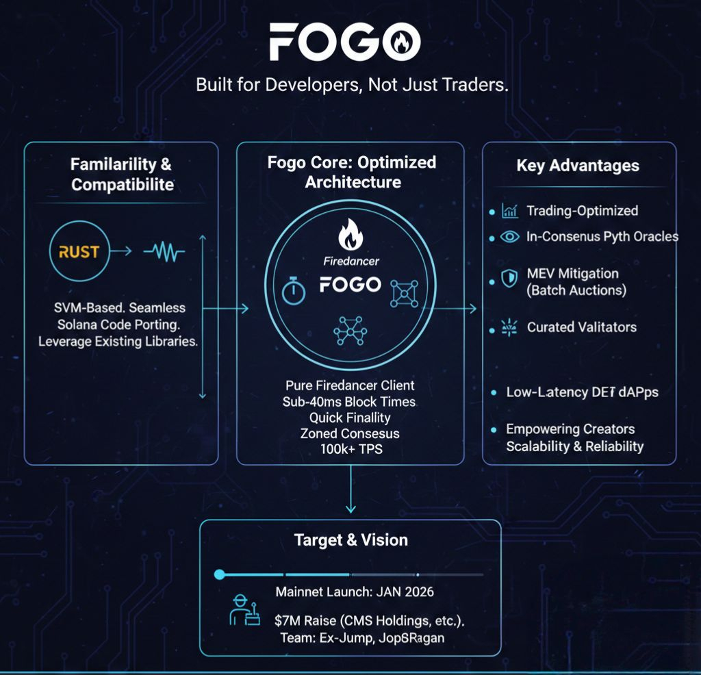 Fogo's appeal starts with familiarity. It's not trying to reinvent the wheel it's polishing it. Built on the Solana Virtual Machine (SVM), it lets developers port code seamlessly from Solana. Use Rust, leverage existing libraries, no steep learning curve. For builders like me, that's huge. Why chase "new" when you can enhance what's proven? Fogo gets that devs want tools that fit their workflow, not a blank slate. It's like upgrading your laptop without losing your files adoption feels effortless.