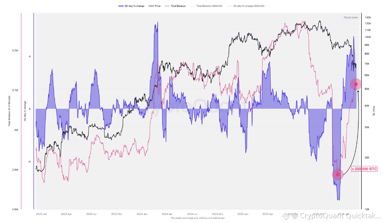 Over this period, the supply held by whales rose from 2.9 million BTC to more than 3.1 million BTC, representing an accumulation of over 200 000 BTC.