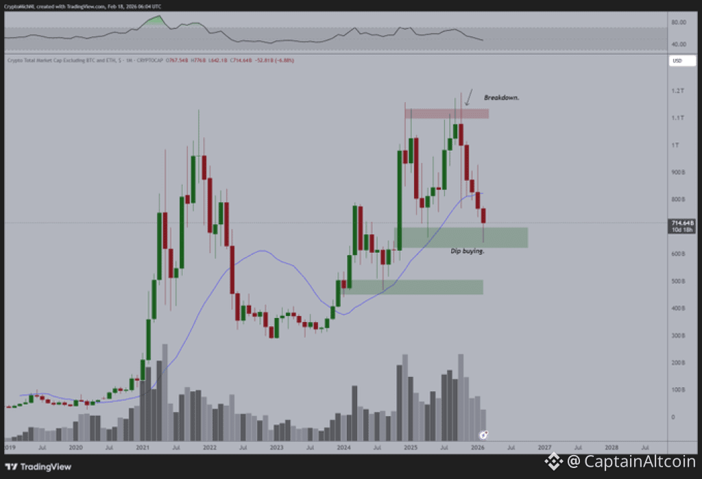 The chart makes the situation clear. Altcoins peaked hard in 2025, then rolled over into a steep drop. Since then, price has been sliding lower and lower, with each rebound getting sold off quickly.