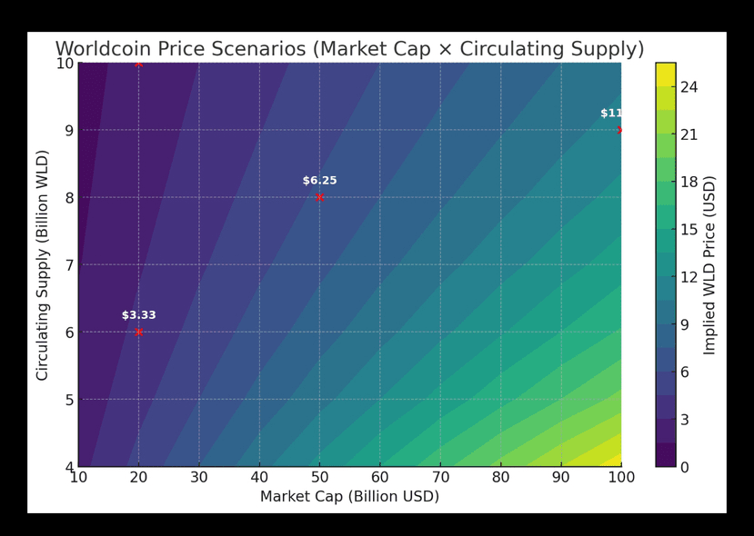 Základní scénář: Pokud WLD dosáhne tržní kapitalizace 20 miliard dolarů s ~6 miliardami v oběhu, cena ≈ 3,33 $ (~1,7× z ~1,93 $).