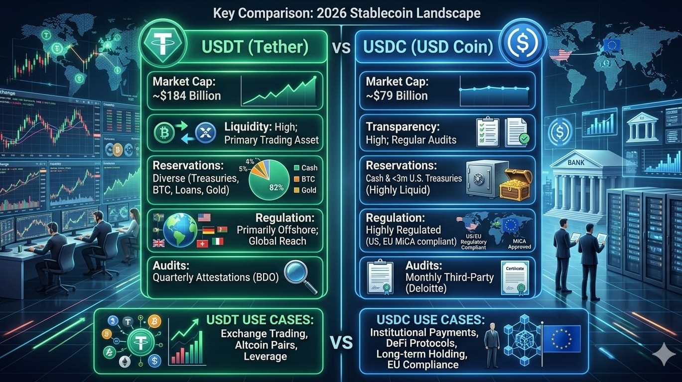 Here is a direct comparison of USDT (Tether) and USDC (USD Coin) based on the latest 2026 data.