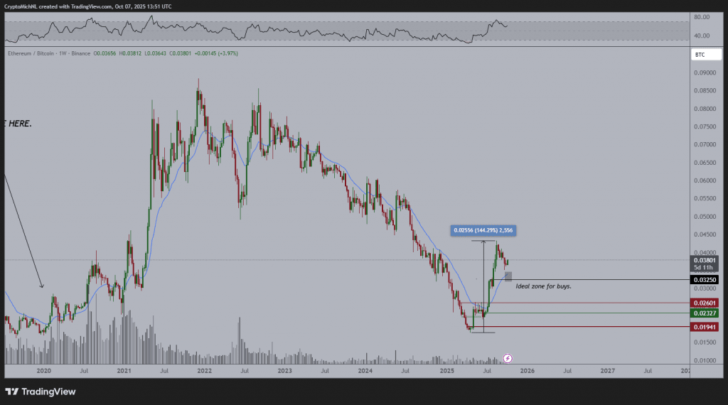 Michaël van de Poppe, zakladatel MN Fund, vyzdvihl dva faktory, které povedou $ETH k novému historickému maximu. Za prvé, obchodní pár ETH/BTC "dosáhl dna" a je připraven na nový vzestup po relativně standardní korekci. Za druhé, zlato vykazuje "šílený parabolický růst", dosáhnuvší vrcholu nad 4 000 $ za unci, což znamená nevyhnutelnou korekci a "spuštění velkého spínače na riziková aktiva".