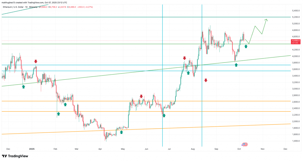 Analytik grafů Matt Hughes poznamenal, že "Ethereum je připraveno na průlom do zóny historického maxima, protože konečně získalo stabilitu nad 4 350 $." Podle jeho slov, pokud tato zóna nadále zůstává jako podpora, historická maxima nejsou daleko.