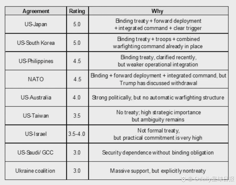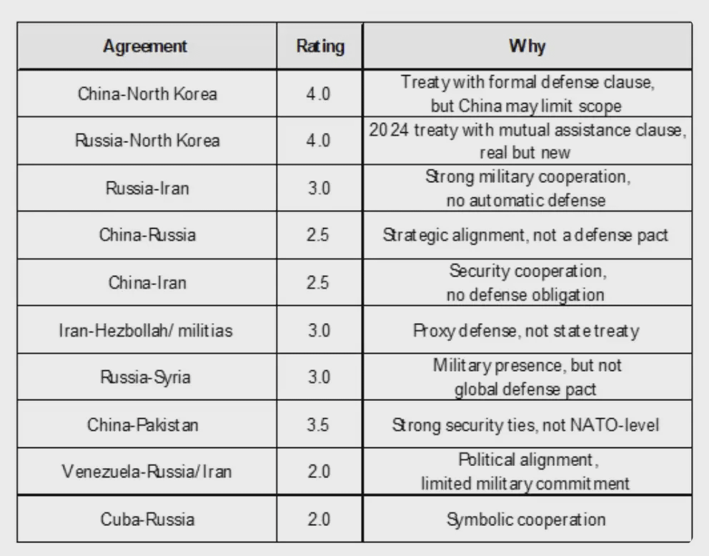 Zde je seznam některých z nejdůležitějších smluv, včetně hodnocení síly závazků od 1 do 5 a stručného popisu každé smlouvy. Celkově se ostatní měřítka aliancí – jako jsou prohlášení vůdců a skutečné akce – většinou shodují s těmito smlouvami. Je však stále zřejmé, že všechny tyto smlouvy, zejména ty, které se týkají USA, mohou být změněny, a skutečné akce nakonec budou mít větší váhu než texty smluv samotných.