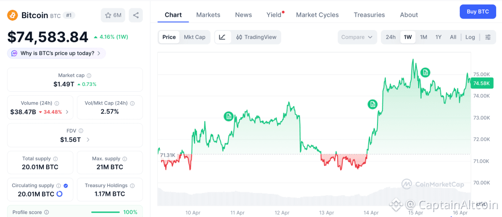 The bitcoin price on April 15 sits at $74,583 according to CoinMarketCap, after BTC briefly touched $76,000 on Iran peace signals and then reversed at the same ceiling that capped the mid March bounce. Goldman Sachs filing for a BTC ETF adds another tier one bank to a pipeline that already includes BlackRock and Fidelity, and cumulative spot ETF inflows now exceed $56 billion.