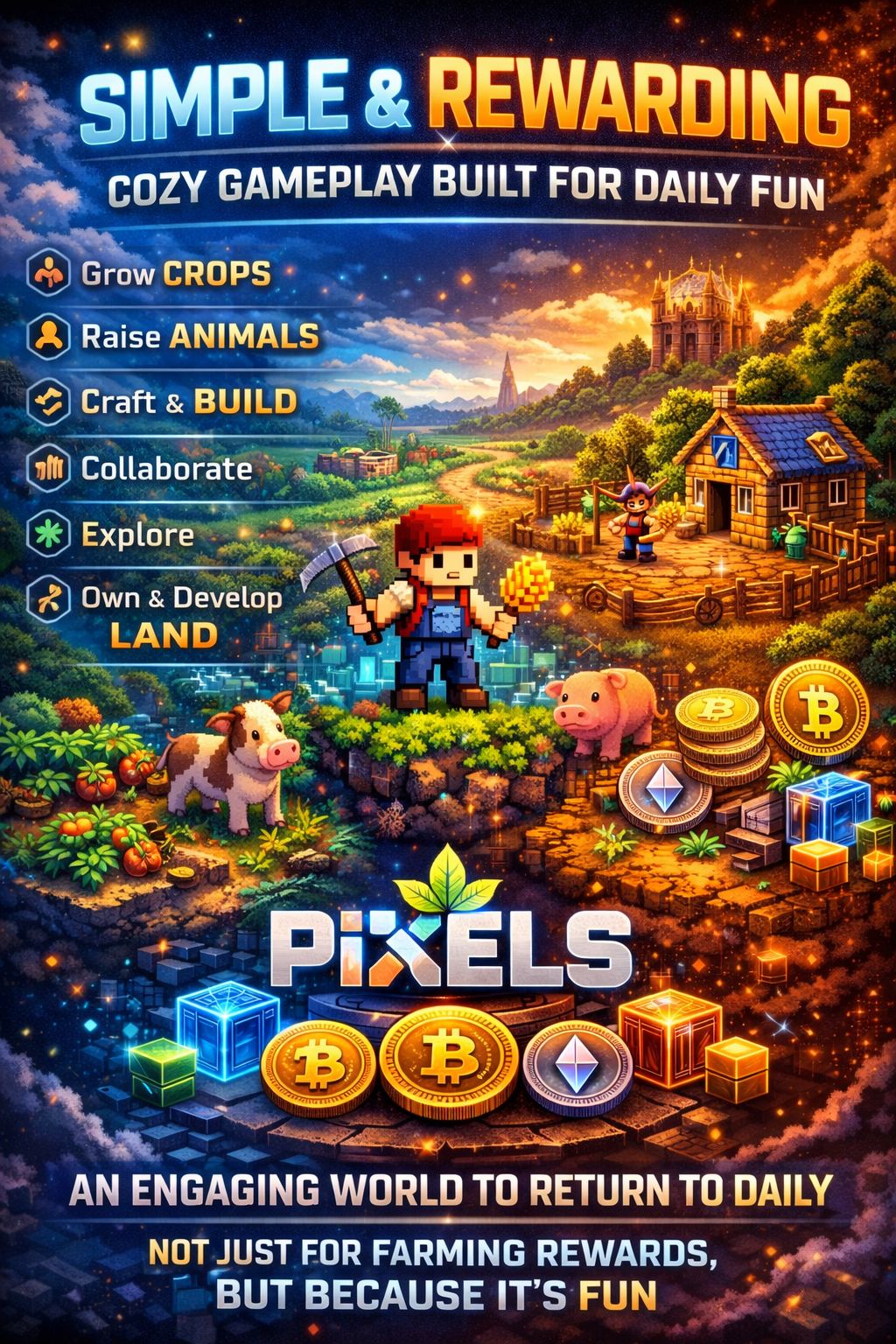 Pixels focuses on creating a cozy, routine-driven environment where players return daily not because they feel forced to farm rewards, but because the game world itself feels rewarding to engage with.