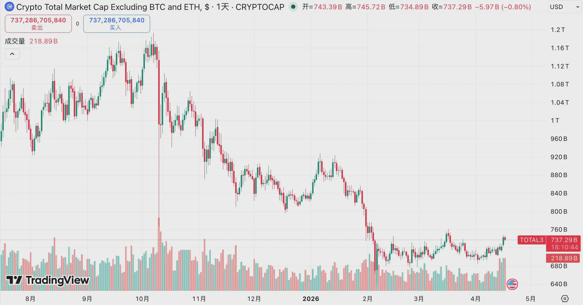 Od prosince 2024 do dubna 2026 celková tržní kapitalizace altcoinů bez bitcoinů a etherů klesla z přibližně 1,16 bilionu dolarů na přibližně 700 miliard dolarů, což představuje téměř 40% ztrátu. Když klesne tržní kapitalizace dostatečně nízko, pravidla hry se změní, cena již nebude určena tržním konsensem, ale tím, kdo má dostatek prostředků.
