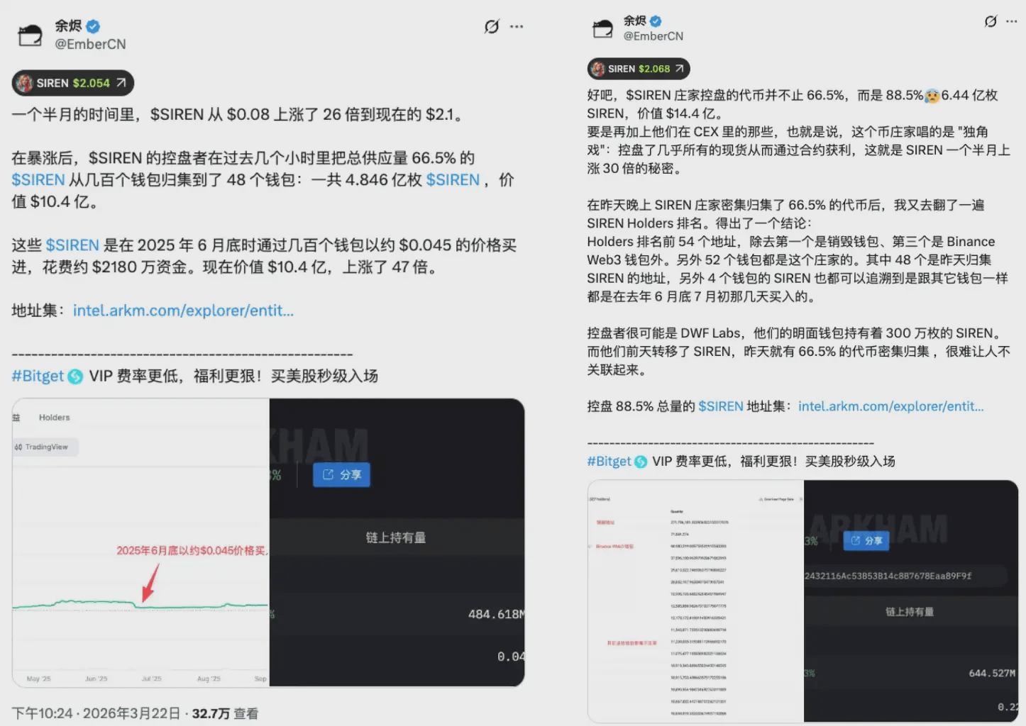 V posledních dvou dnech prudký nárůst tokenu SIREN poskytl analytický případ. SIREN se na konci března rychle zvýšil a vyprodukoval pozoruhodný růst. 24. března zaslal blockchainový analytik EmberCN varování: Jeden subjekt mohl kontrolovat až 88 % oběhu SIREN, což v té době odpovídalo přibližně 1,8 miliardy dolarů. Zpráva se rozšířila, SIREN klesl během dne z 2,56 dolaru na 0,79 dolaru, což představuje pokles o více než 70 %. Během rychlého úniku cen se téměř nikdo nemohl dostat ven za rozumnou cenu, protože ta cena nikdy nebyla určena trhem.