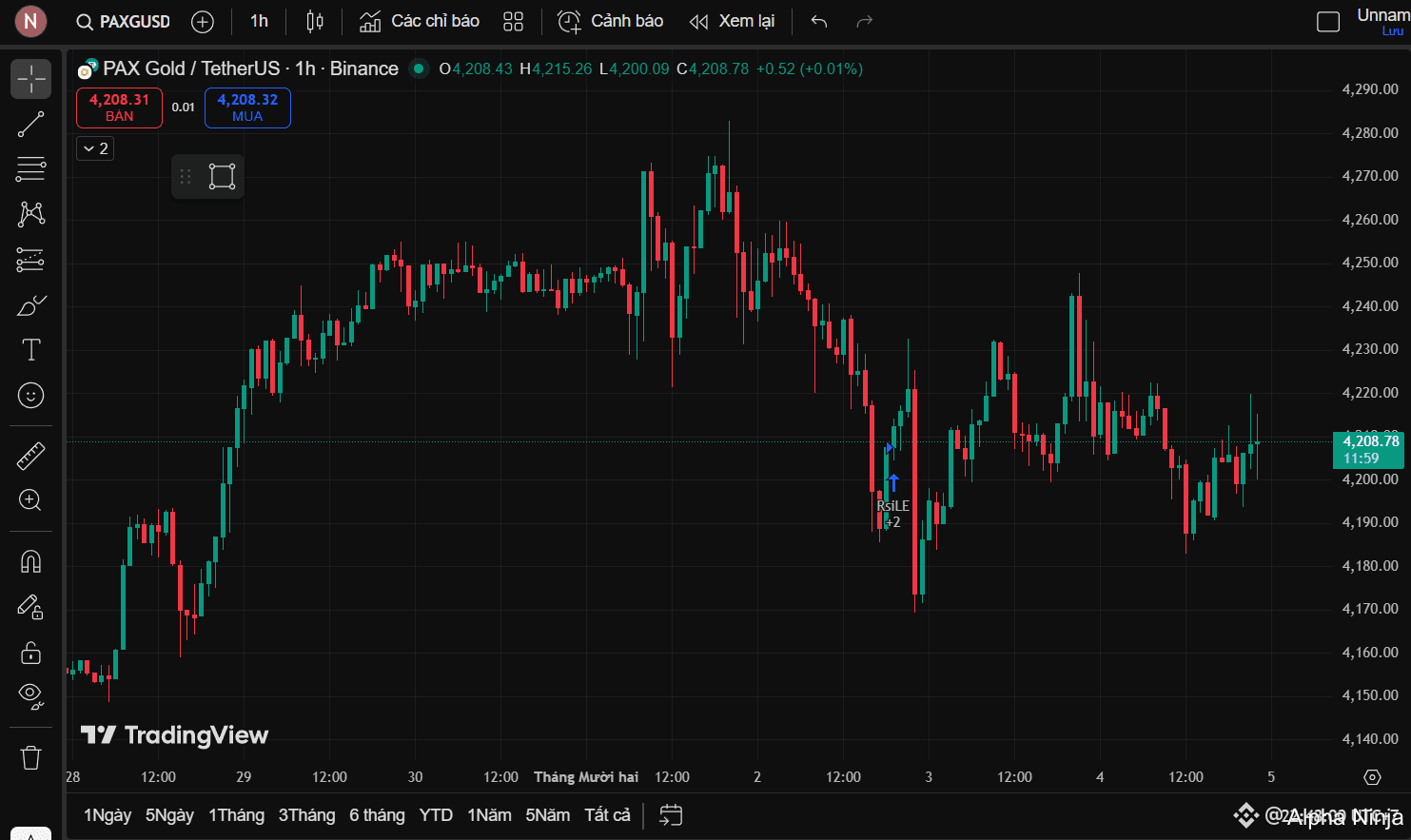 PAXG đang thể hiện đúng chất vàng: rơi không sâu, bật nhanh, rồi giữ giá cực lì. Vùng 4180–4220 được hấp thụ liên tục, râu dưới bị kéo lên ngay khi xuất hiện. Điều này cho thấy phe gom đang bảo vệ vùng đáy ngắn hạn.