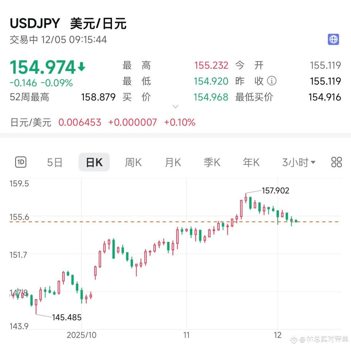 需重点关注日本央行(日央行)动向,昨日消息显示,日本政府已默许日央行大概率在12月中旬释放加息信号。此前已提及,若套息交易实质性退潮,将引发大量资金从美国市场撤出,兑换为日元回流日本本土,进而推动美日汇率大幅走低。近期这一趋势已初步显现,美日汇率连续下行并跌破155关键点位,印证了部分资金正从美元资产转向日元资产。
