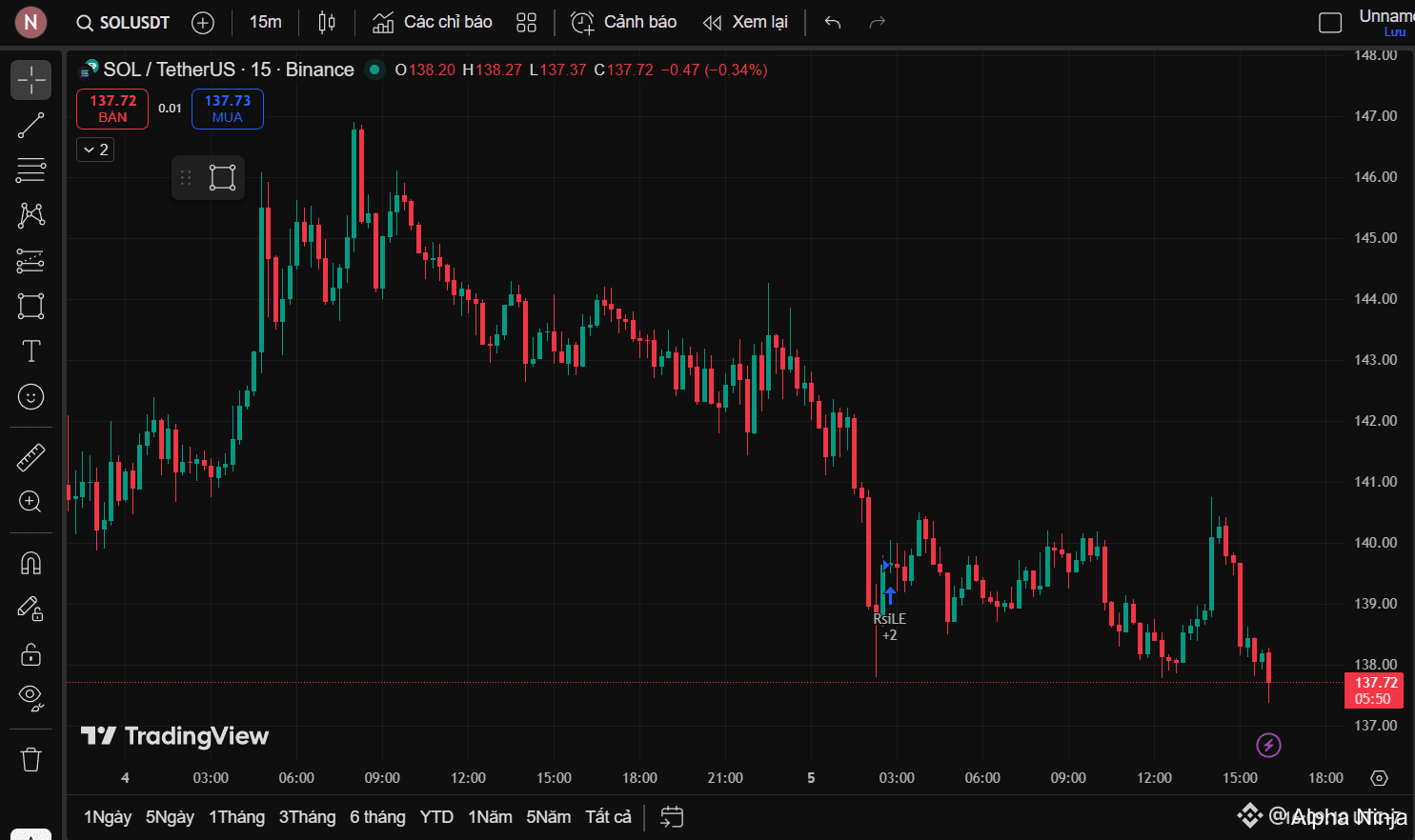 $SOL đi yếu hơn $BTC nhưng vẫn giữ cấu trúc đáy cao hơn trong micro-frame. Một khi BTC nhích 0.3–0.5%, SOL thường bật mạnh hơn. Vùng 137–138 là đáy ngắn hạn, không thủng nghĩa là chuẩn bị cho cú kéo kỹ thuật. Mục tiêu gần nhất: 140–142.