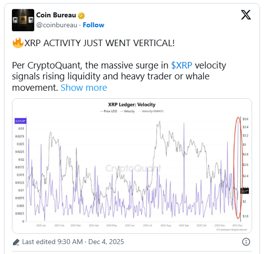 $XRP Trh XRP vstoupil do prosince s neobvyklým pohybem na svých datech sítě. Cena aktiva zůstala blízko 2,1 USD, avšak graf od CryptoQuant odhalil posun, který upoutal pozornost držitelů XRP.