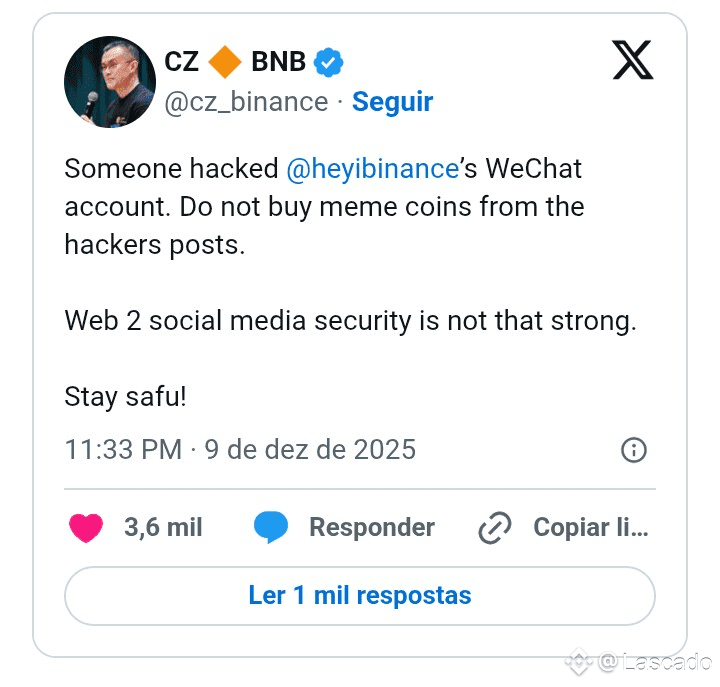 CZ alertou que os hackers publicaram recomendações falsas sobre a memecoin e pediu que os usuários não dessem atenção às mensagens. Em sua conta no X, ele reforçou: “A segurança das redes sociais Web2 não é tão robusta. Protejam-se! Não comprem memecoins divulgadas por hackers.”