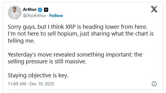 Arthur (@XrpArthur) otevřel pevnou linii skepticismu, když řekl svým následovníkům: „Myslím, že XRP se odtud dostává níže.“