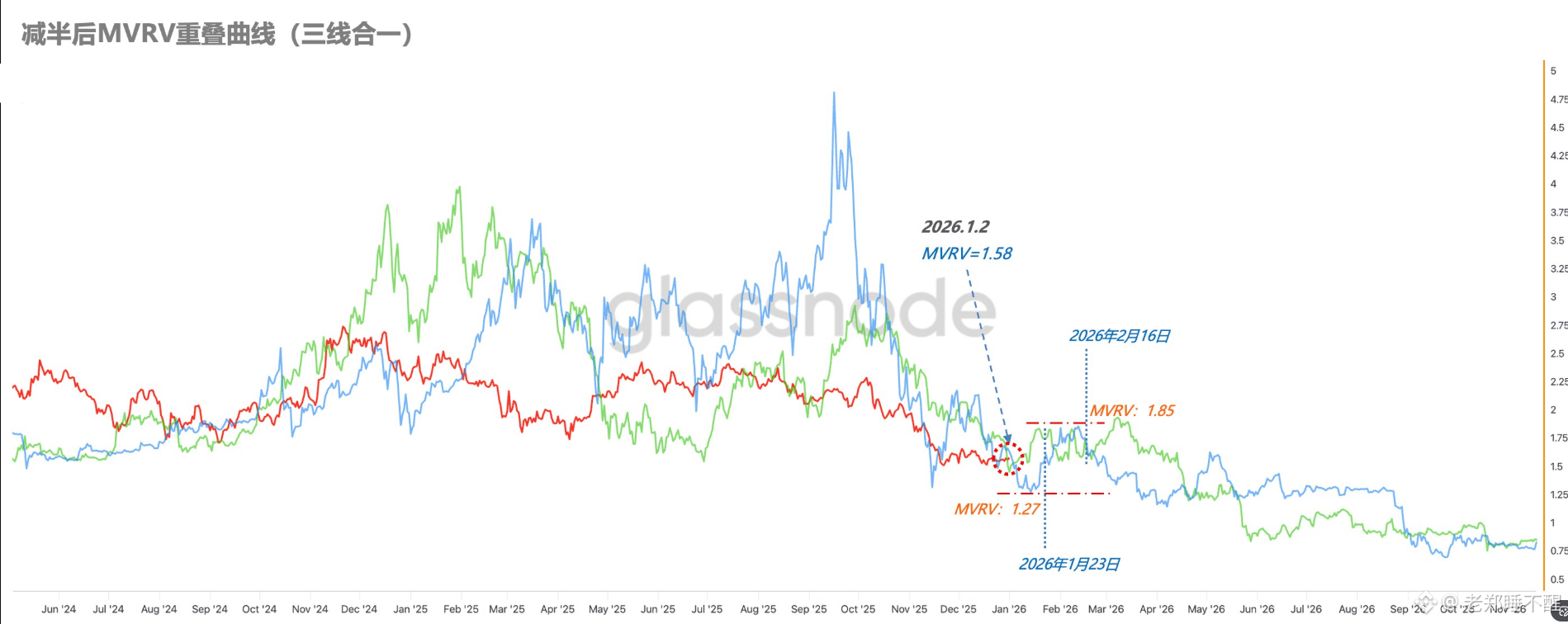 根据“三线合一”指标显示,接下来在1月23日之前MVRV最低在1.27,对应到BTC的价格为$71,000;但我觉得按目前的综合情况看(链上数据+K线指标)到这个最低点的概率并不大。