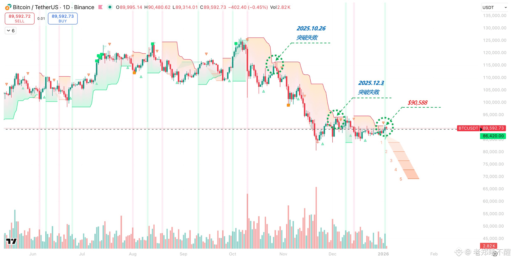 但前2次发起冲击的时候,价格距离趋势线还有一定的距离,而本次已几乎就在眼前了。其实昨天的高点已突破了$90,588,但碰了一下又回来了。