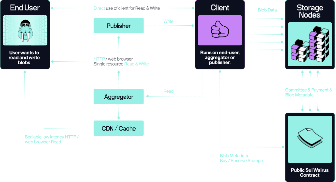 • Koncový uživatel — Uživatelé Walrusu, kteří chtějí ukládat data (bloby), jako jsou obrázky, zvuk atd., na Sui. Tyto bloby jsou soubory dat, které mohou uživatelé přistupovat a načítat.