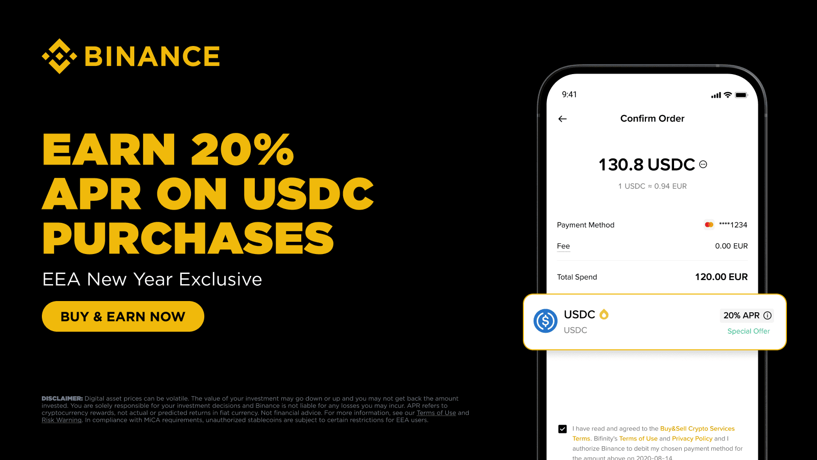 Binance je nadšená, že může spustit exkluzivní propagaci pro EEA k oslavě nového roku. Během propagačního období mohou všichni uživatelé EEA, kteří budou nakupovat kryptoměnu a přihlásí se k jednoduchému výdělku USDC flexibilním produktům, získat až 20 % APR na 10 dní, což zahrnuje exkluzivní 19 % bonusovou tierovanou APR navíc k odměnám Real-Time APR.