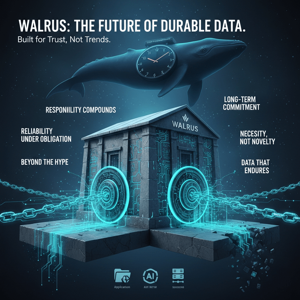 Zpět k většímu pohledu: blog Walrus zobrazuje jako protokol, který očekává, že odpovědnost bude komponovat. Dlouhodobé úložiště vytváří dlouhodobé očekávání. Jakmile je data zaznamenána, síť přebírá závazek, který přežije tržní cykly i změny názorů. Walrus se zdá být vědom toho, že tento závazek je jak jeho riziko, tak jeho ochranná bariéra. Málo systémů je ochotno přijmout takovou časovou odpovědnost. Ti, kdo to dělají, často zaujímají největší význam, když se výpověď vytratí a spolehlivost je jediným měřítkem, které má smysl.