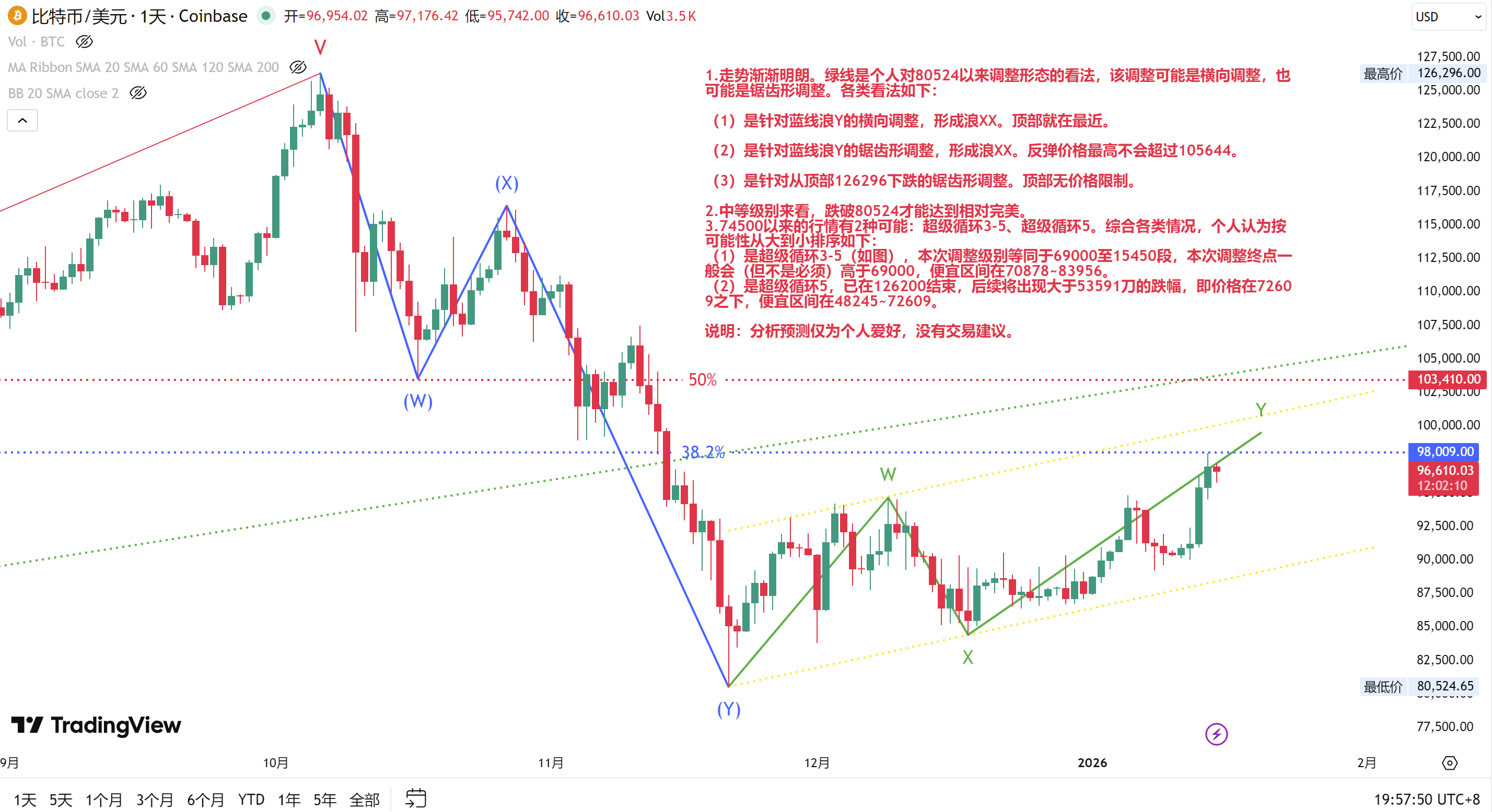 (1) je super cyklus 3-5 (viz obrázek), úroveň této úpravy odpovídá úseku od 69000 do 15450, konec této úpravy bude obecně (ale nemusí být) vyšší než 69000, levný rozsah je 70878~83956.