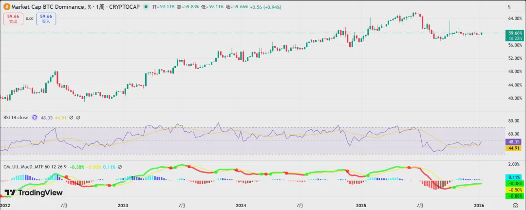 Z výše uvedeného obrázku můžeme vidět, že BTC.D zůstává na relativně vysoké úrovni kolem 59 %, celkový sentiment na trhu je obecně opatrný a konzervativní, což naznačuje, že prostředky pokračují v považování Bitcoinu za hlavní aktivum a nedochází k širokému přílivu do rizikovějších altcoinových kategorií. To je částečně způsobeno tím, že ETF prostředky mají určitou podpůrnou roli (včetně stabilního akumulace institucionálních prostředků) a může to být také spojeno s nejistotou v současném makroprostředí (například ekonomická a regulační nejistota).