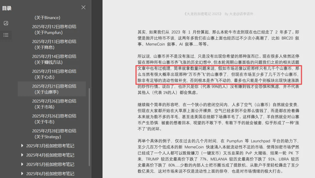 Například některé výrazy nebo vzorce, které se zdají mít určité konsensuální povahy, mohou snadno vést k chybám v chápání nebo zavádění. Jednoduchý praktický příklad: mnozí lidé očekávali, že když Bitcoin v tomto býčím trhu dosáhne historického maxima, následně přijde tradiční altcoinová sezóna, ale ve skutečnosti jsme nezaznamenali takovou altcoinovou sezónu, ale spíše lokální, rychlou mini altcoinovou fázi. Tento problém jsme také několikrát probrali v historických článcích, zájemci si mohou vyhledat a podívat se zpět na historické články, jak je znázorněno na obrázku níže.