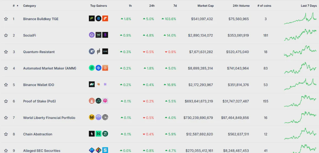 Pokud ale chcete investovat část svých peněz do riskantní hry, pak pojem altcoin zahrnuje nejen Memecoiny, ale také mnoho specializovaných oblastí. Například v sekci Categories na platformě Coingecko je nyní 654 kategorií. Pokud se chcete zúčastnit, můžete provést nezbytný výběr, jak je znázorněno na obrázku níže.
