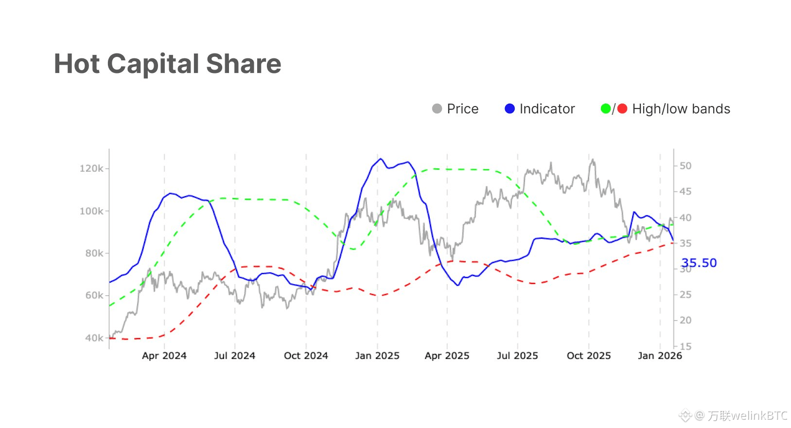 ③"Hot Capital Share"(热钱占比/投机资本占比)。这是一个非常专业且富有洞察力的链上数据图表