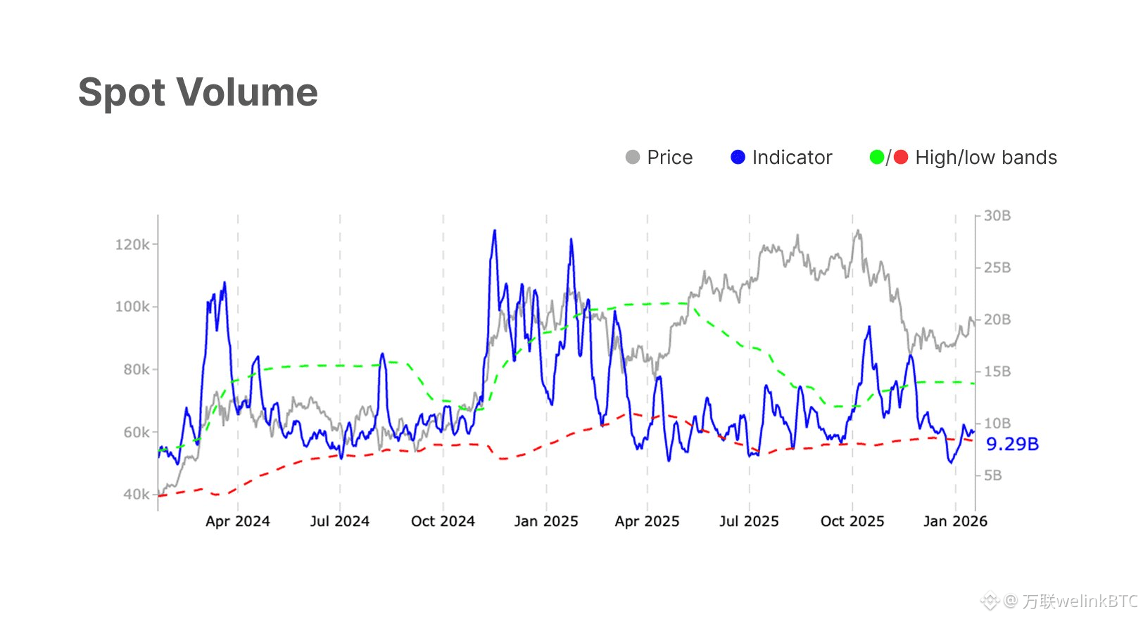蓝色线 (Indicator - Spot Volume): 代表现货市场的交易量指标。当前数值: 9.29B。这是一个相对较低的水平。