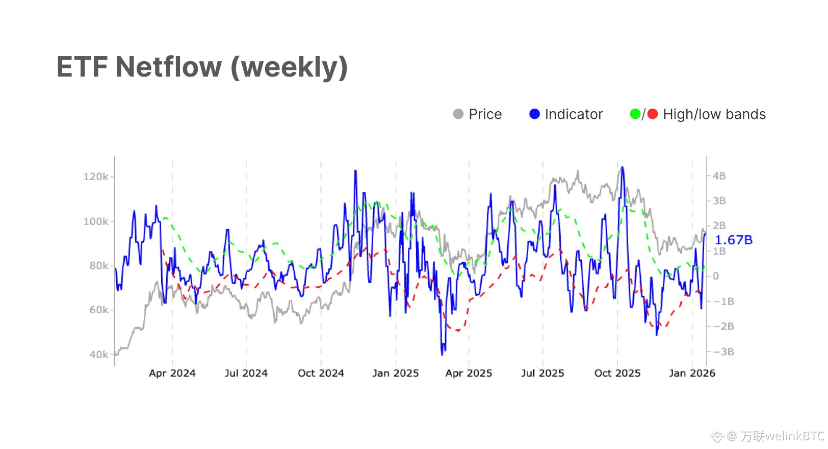 蓝色线 (Indicator - Netflow): 代表 ETF 的每周净流量。右侧坐标轴显示资金量,正值(0轴上方)代表净流入(买入),负值代表净流出(卖出)。