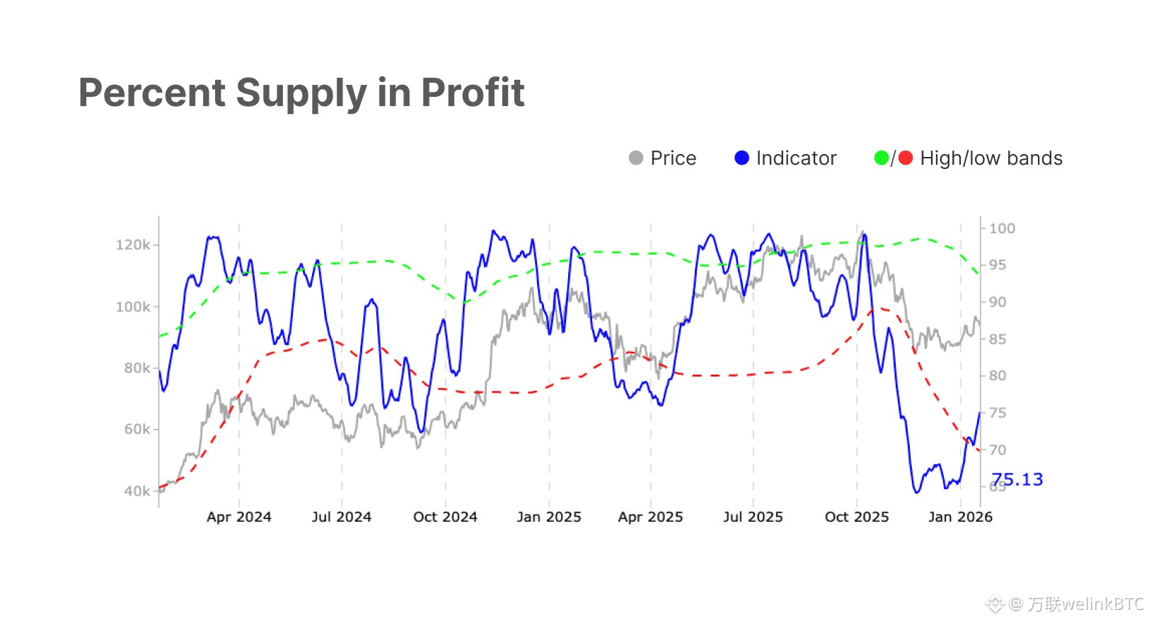 ②“盈利供应百分比” (Percent Supply in Profit) 的链上数据指标,时间跨度从 2024 年初延续至 2026 年初。