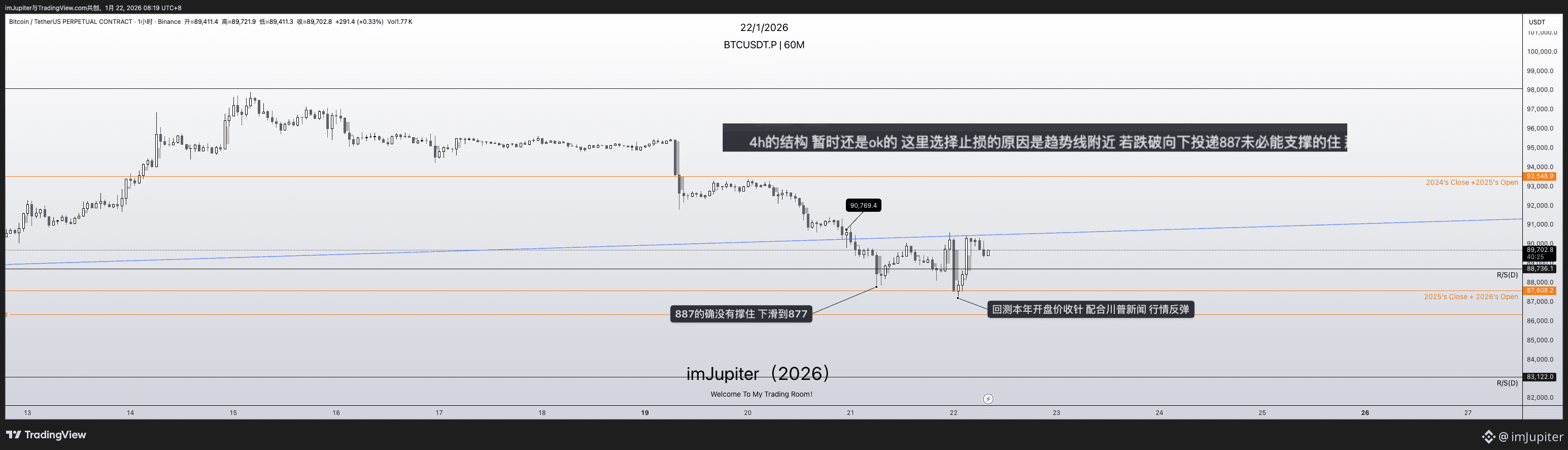 目前 我依然谨慎看涨 别忘了之前做多关注的887 在突破到97k后做深度回测也是一种延续h4上涨结构的方式 风险点在我看来依然是这条趋势线的跌破