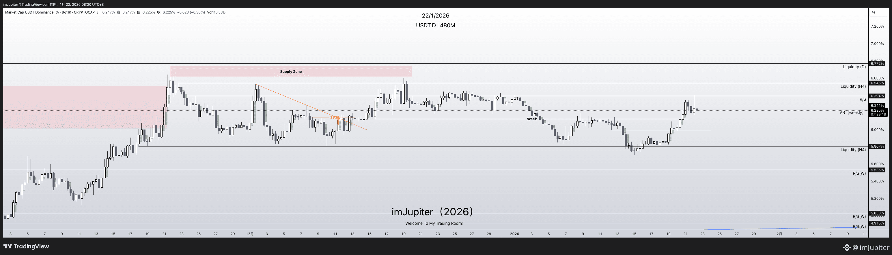 所有看涨的观点都源于这里我对usdt的判断6.241%的ar已经逐渐成为htf上的压力 除非突破踩稳6.6% 否则我依旧看涨市场