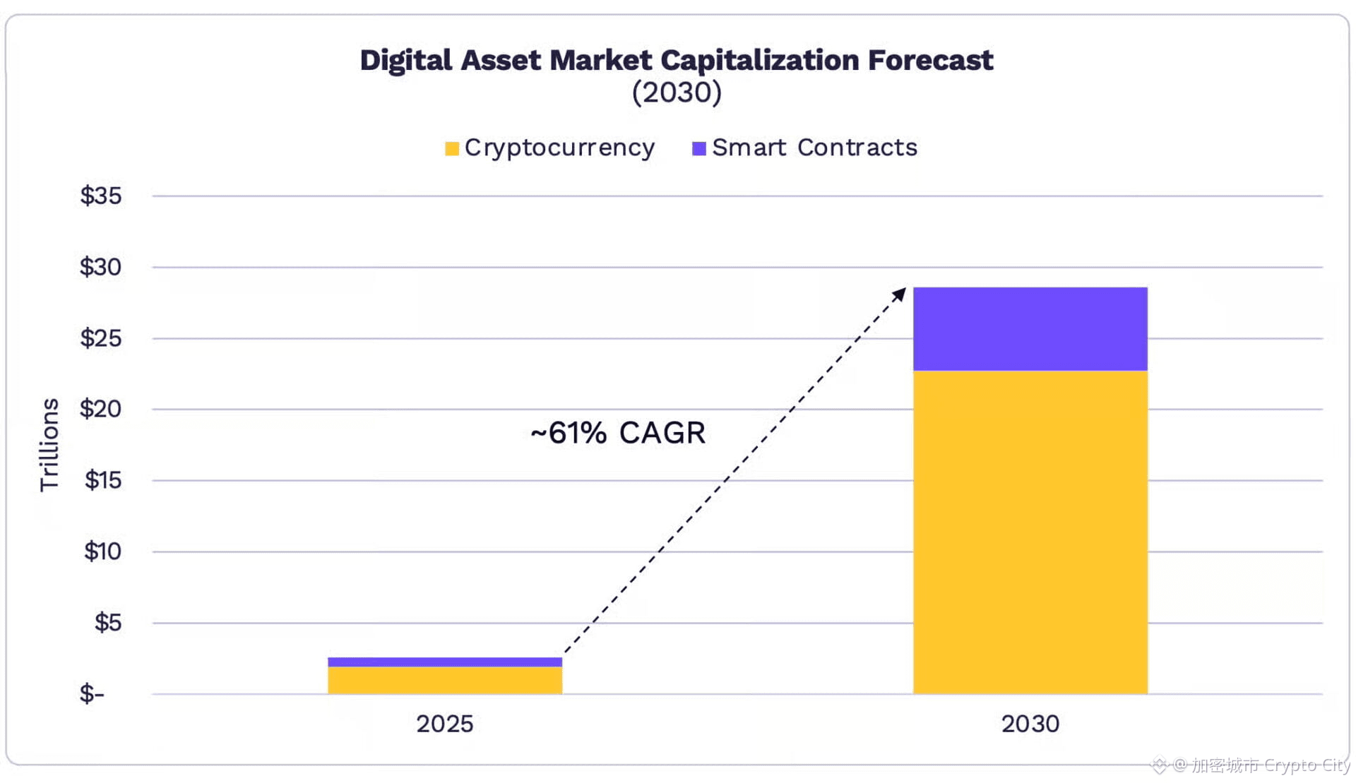 除了比特幣,方舟還認為,未來加密貨幣市場的剩餘市值,將主要由以太坊等智慧合約平台撐起,隨著鏈上金融、證券代幣化的普及,到 2030 年,智慧合約平台整體市值可望達 6 兆美元、年複合成長率約 54% 、年化收入可達約 1,920 億美元。