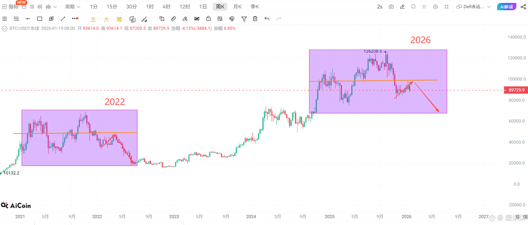 如图2022年第一季度反弹后继续来一路下跌。2026年这一季度周线走势极其相似。个人觉得周线BTC能回到10w 选择避险是必要的。