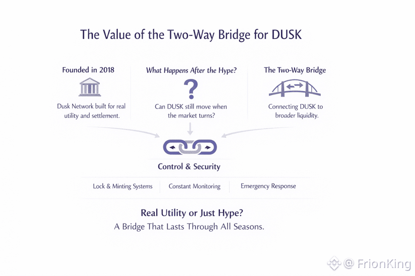 Two-way bridge, the practical piece that expands DUSK’s utility, is, to me, the kind of upgrade you only value properly after living through a few cycles. Dusk Network was founded in 2018, and if you have watched enough projects rise and fade, you learn one thing fast, what keeps a system alive is not the story, it is the path of liquidity, and whether the token is used like a working component.