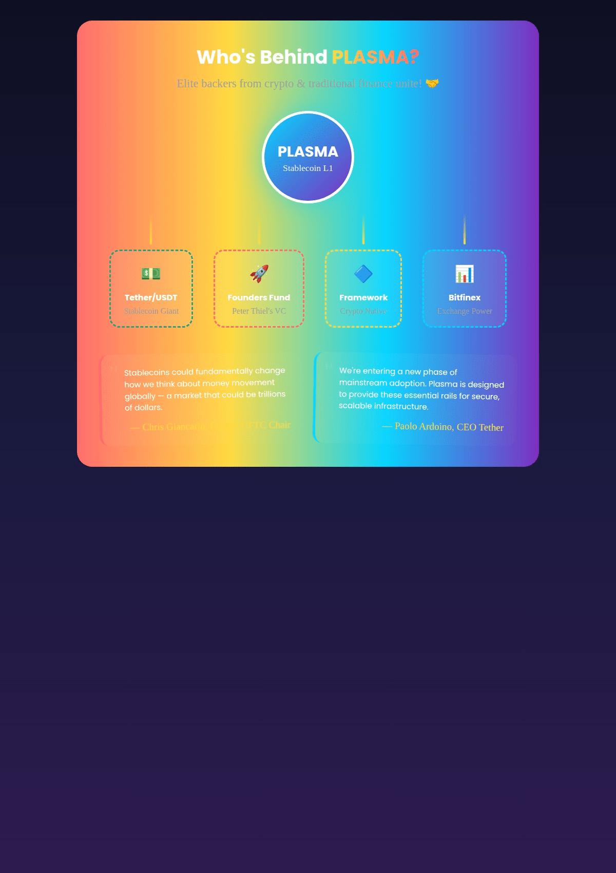 Podpora vypráví svůj vlastní příběh. Generální ředitel Tetheru Paolo Ardoino veřejně hájil projekt a prohlásil, že bezpečná a škálovatelná infrastruktura je zásadní, protože adopce stablecoinů vstupuje do hlavního proudu. Fond zakladatelů Petera Thiela vedl investice spolu s Framework Ventures, Bitfinex, Flow Traders a DRW. Tato koalice představuje těžké váhy z kruhů kryptoměn a tradičního financování.