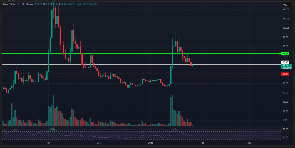 Dash klesl o 29% kvůli právnímu strachu + vybírání zisků, zatímco XMR zůstává stabilní. Je $60 výhodná cena pro privátní coin, nebo je to jen zastávka před návratem na $50?
