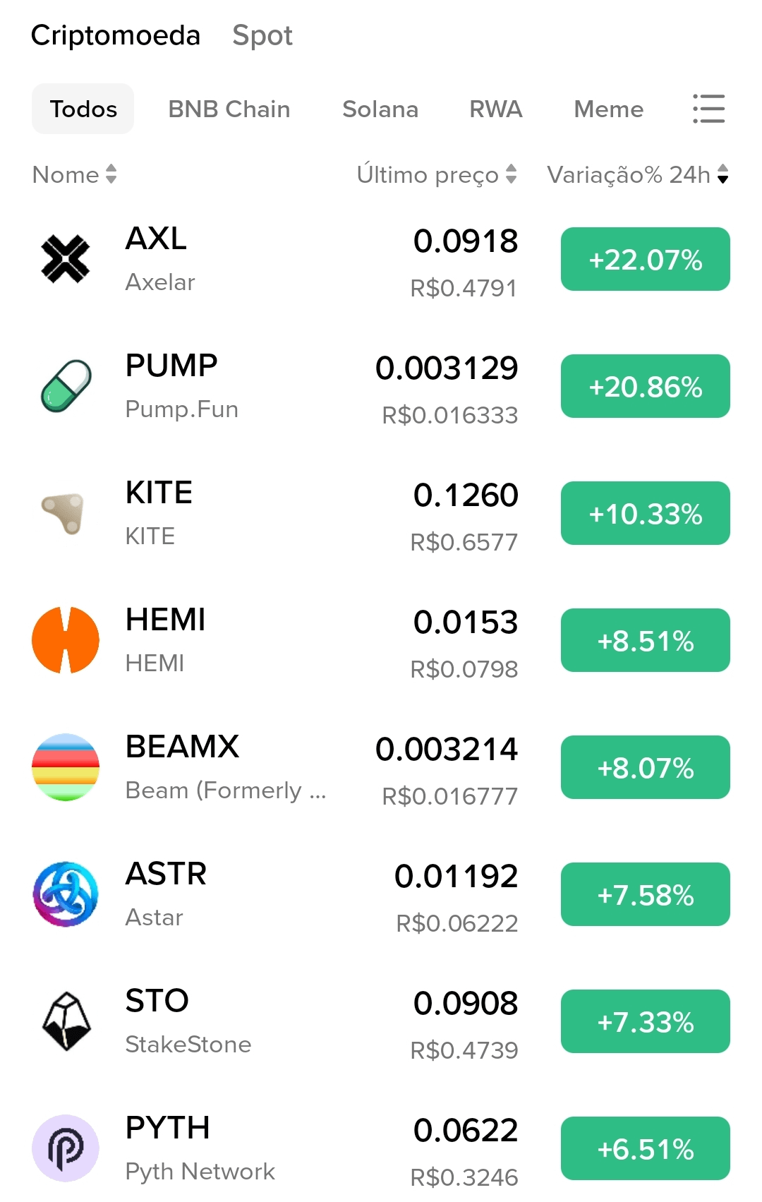 - PYTH (Pyth Network): Uzavírá seznam s +6,51%, obchodováno za R$ 0,3246.