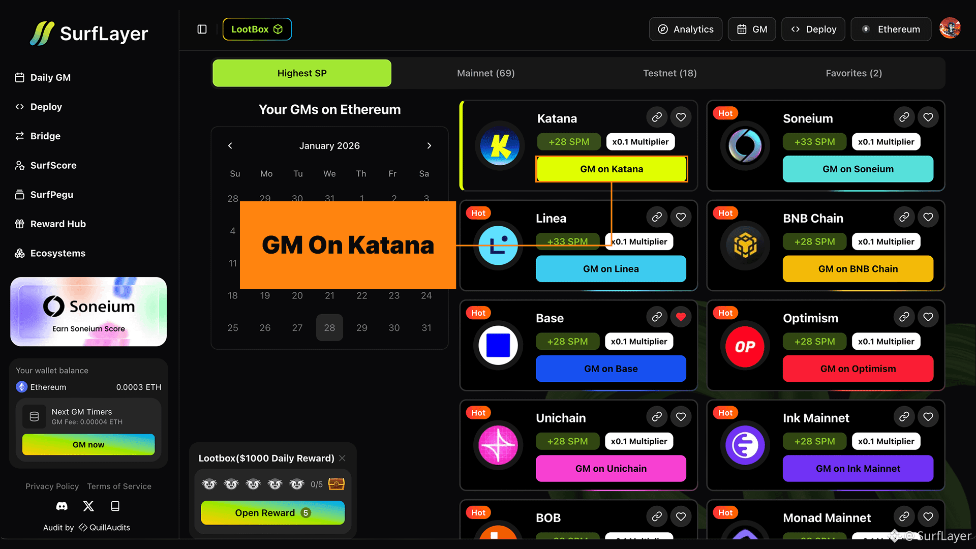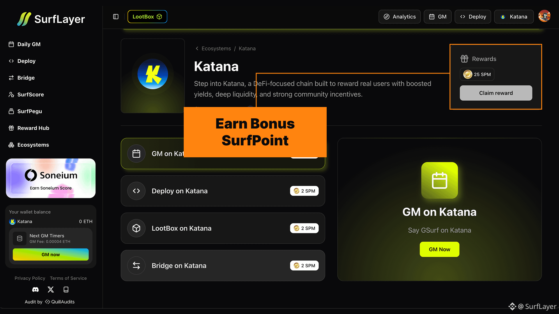 By combining low-cost interactions, clear tooling, and transparent reward mechanisms, SurfLayer helps users build a credible on-chain identity on Katana — one action at a time.