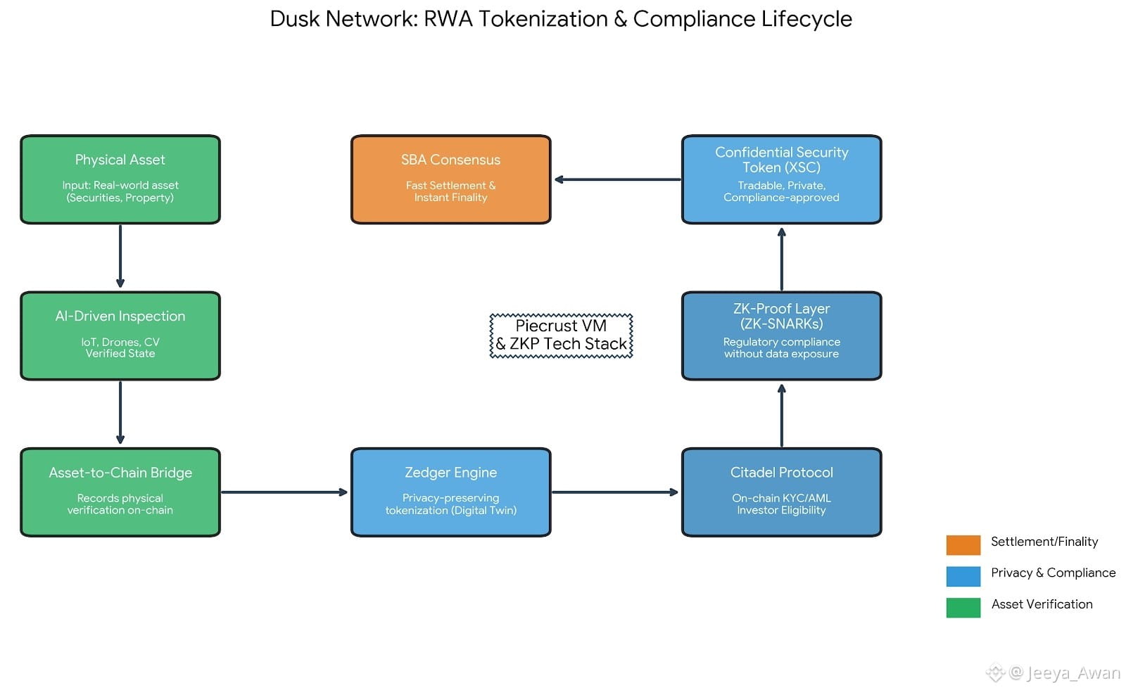 Unlike traditional blockchains, Dusk integrates zero-knowledge proof (ZKP) technology and the Piecrust virtual machine, enabling the direct application of legal and regulatory constraints through smart contracts. This innovation ensures the secure and compliant digitization of entity assets without disclosing any sensitive information.