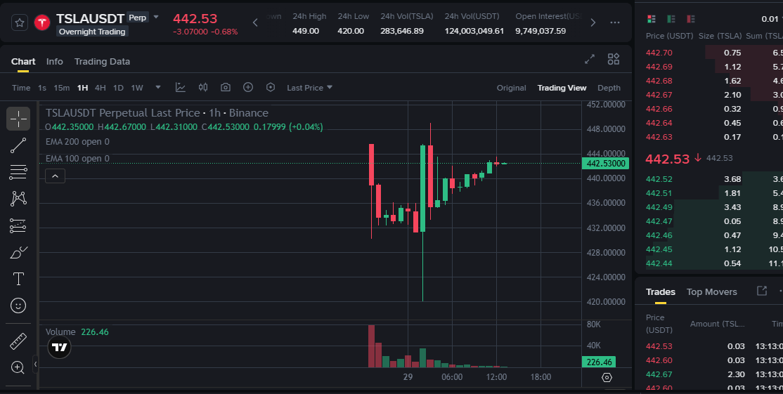 Pamatujte, že tyto TradFi Perps nejsou oficiálně spojeny s, sponzorovány nebo afilovány s firmami jako Tesla nebo burzami. Umožňují vám obchodovat 24/7, ale je důležité vědět, že cena se může pohybovat jinak než na běžném akciovém trhu, zejména mimo běžné obchodní hodiny, kdy je méně aktivity. O víkendech může být obchodování omezeno na příkazy „pouze ke snížení“ jako bezpečnostní opatření.