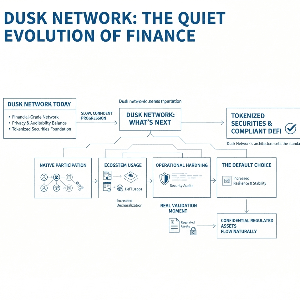 Budoucnost Dusk Network není definována marketingovými slogany, ale postupným, strukturálním pokrokem. Její plán se zaměřuje na rozšíření domácí účasti, zvyšování adopce ekosystému, posilování bezpečnosti a umožnění reálných toků důvěrných regulovaných aktiv.