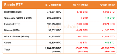 Peníze v den: Fondy prodaly čistě -7,856 BTC, což odpovídá obrovskému odlivu -$653.98 milionů USD.