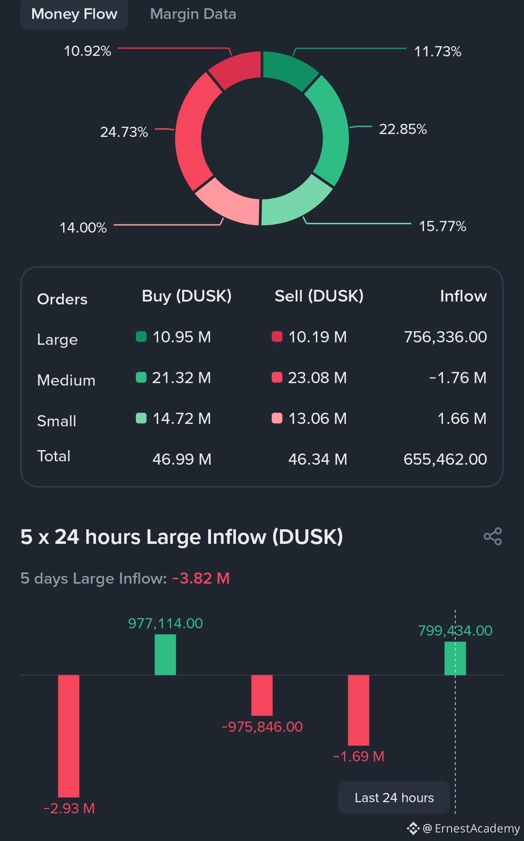 The recent Money Flow Data of Dusk token is showing signs of Smart Money accumulation with large orders (whales): buy volume at 10.95 million against sell at 10.19 million and net inflow of +756K DUSK.